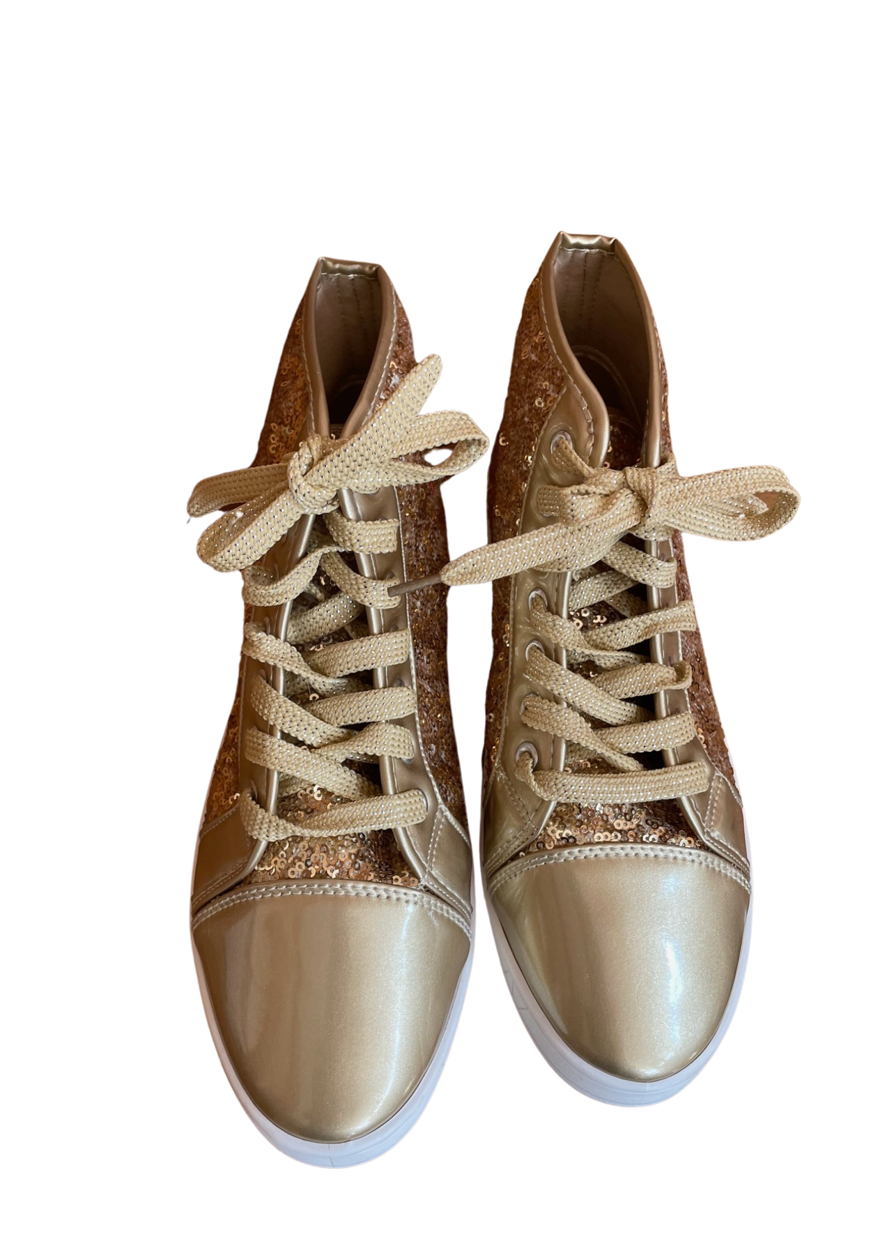 Les baskets arborent une couleur dorée brillante rehaussée de paillettes sur les côtés.