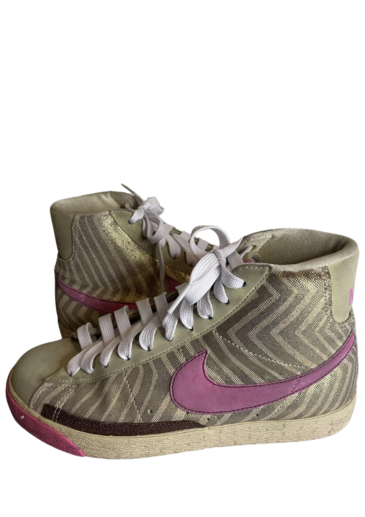 Ces baskets montantes présentent un design unique avec une combinaison de couleurs beige, rose et violet. Le logo Nike est bien visible sur le côté extérieur et sur la languette, offrant une signature emblématique.