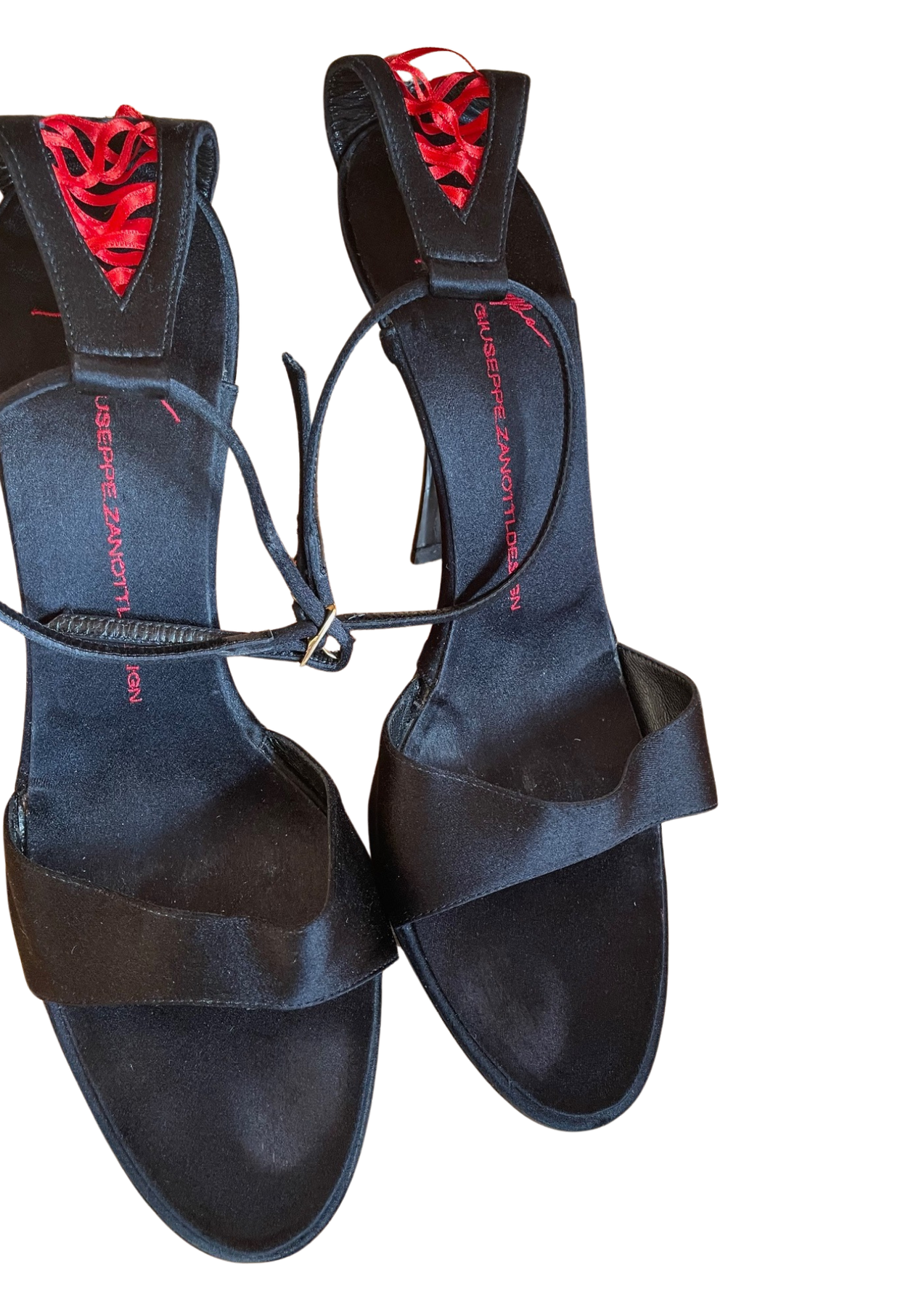 - 🏷️ Marque : Giuseppe Zanotti - 🌈 Couleur : Noir et rouge - 💎 Matières : Satin et Cuir - 📦 État : Très bon état, semelles refaites