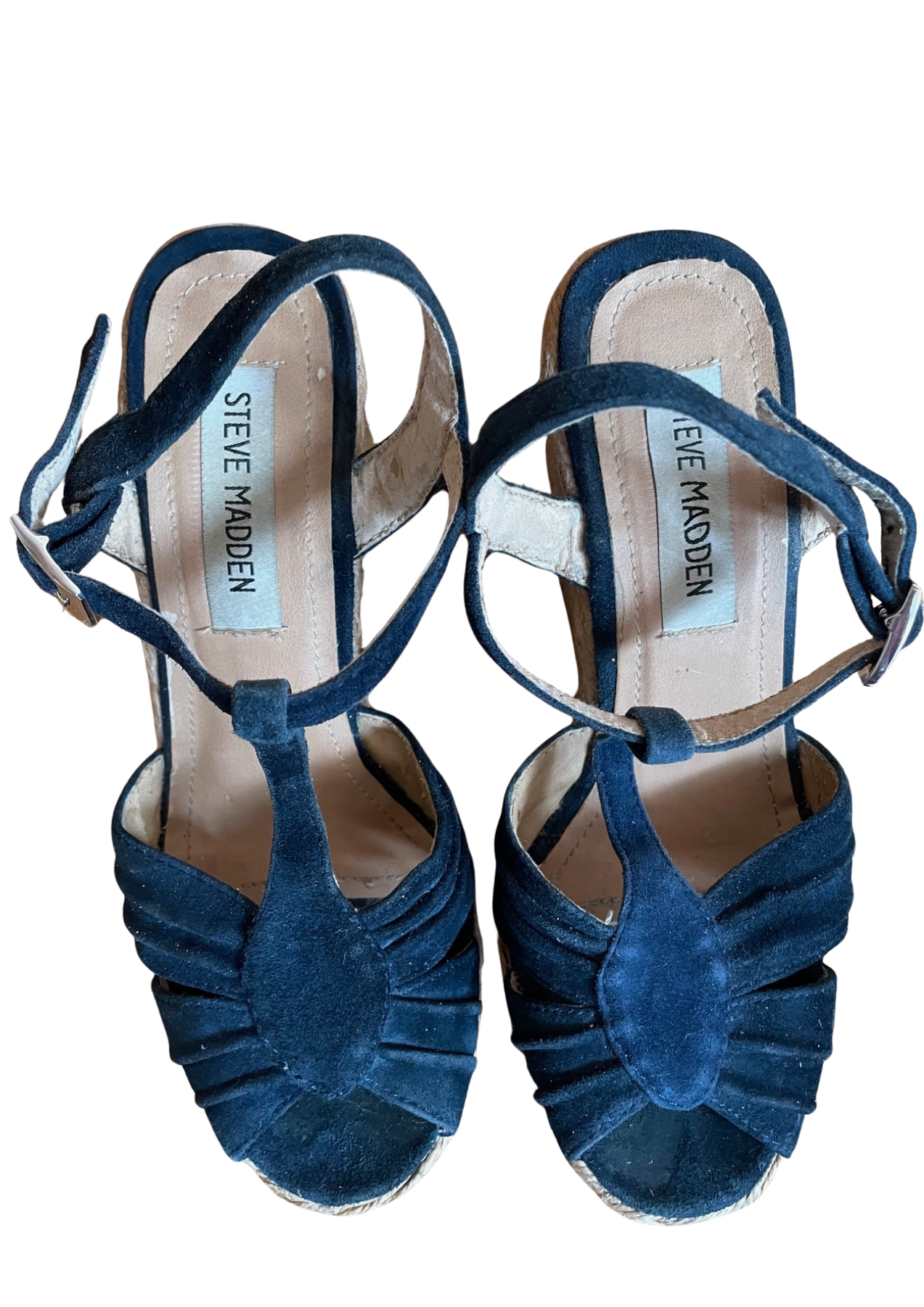 Talons: 11 cm - 🏷️ Marque : Steve Madden - 🌿 Matières : Suédine et Corde - 🎨 Couleur : Bleu - 📦 État : Bon état
