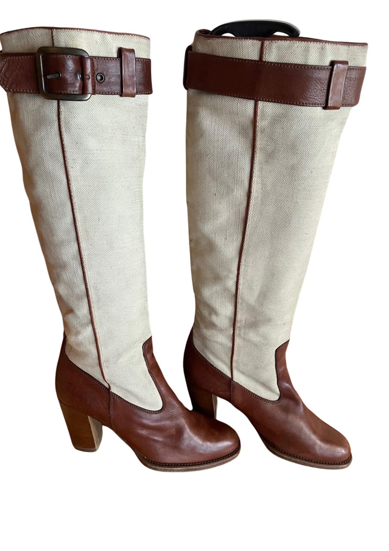 Les bottes ont une allure élégante avec un mélange de cuir marron et de toile beige qui s'étend sur toute la tige.