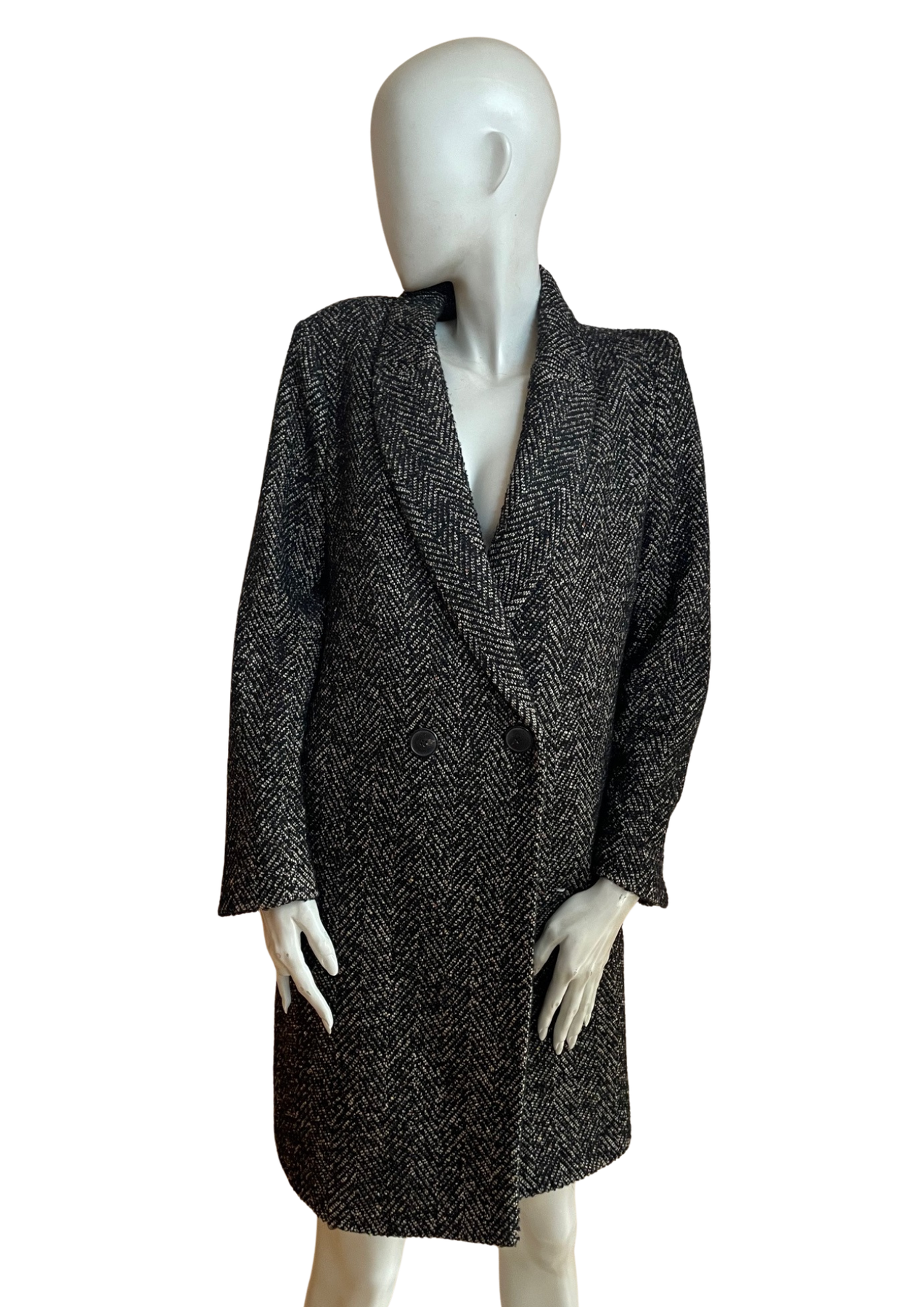 Son col à revers généreux, ses boutons noirs discrets et sa belle longueur créent une silhouette élégante, facile à associer avec un jean, un pull oversize ou une tenue plus habillée.