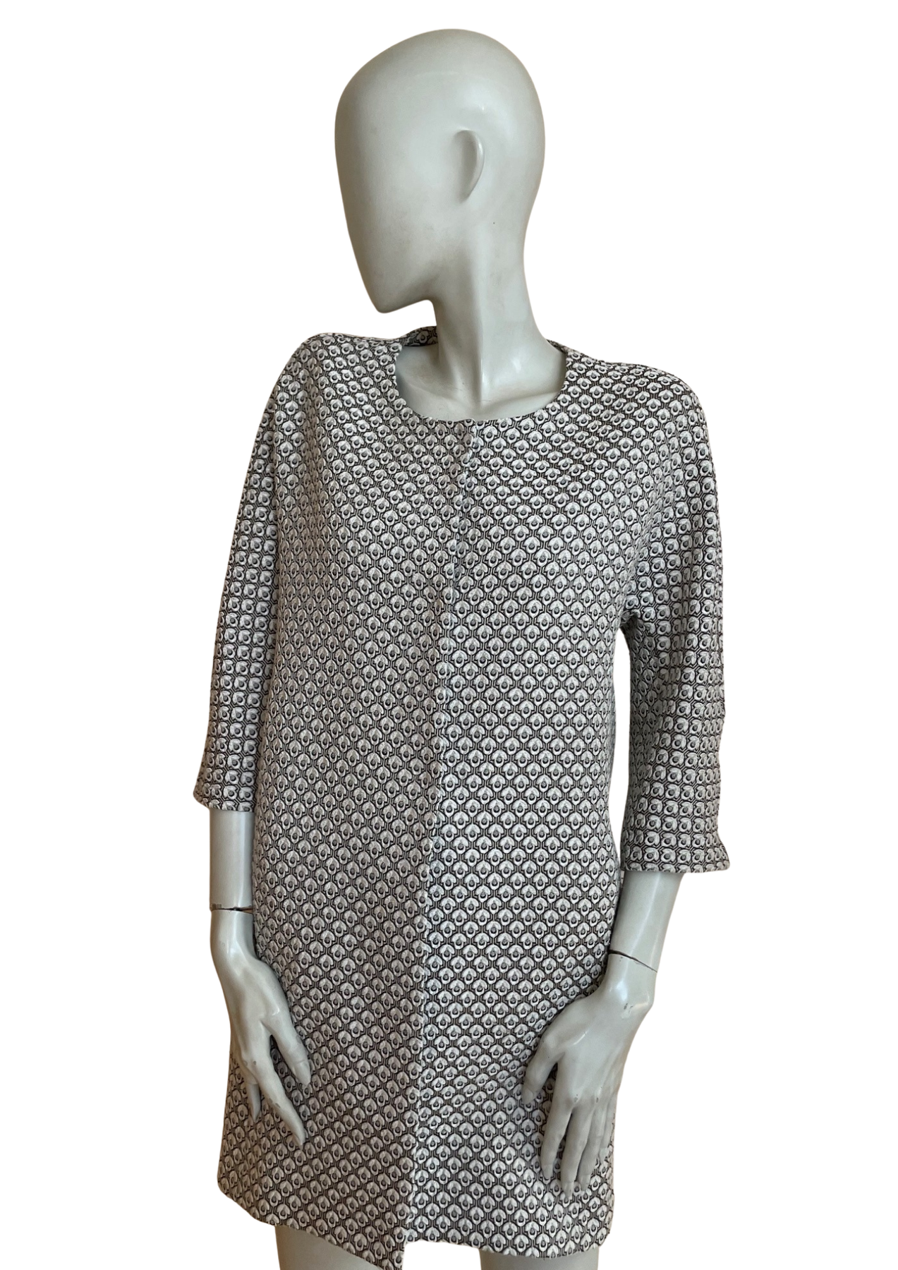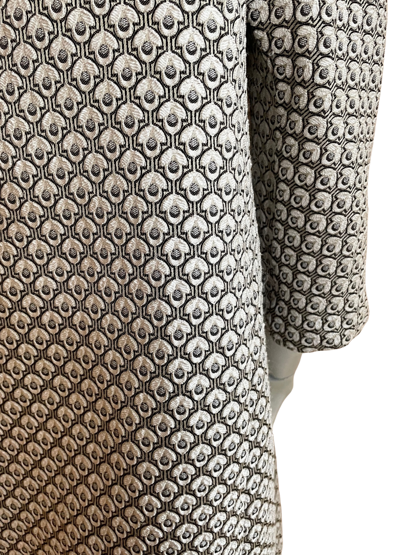 đč DĂ©tails du modĂšle :Marque : Angela DavisMotif graphique en relief noir & blanc cassĂ© đFermeture discrĂšte Ă lâavantManches 3/4 pour un style chic et Ă©purĂ©Longueur mi-cuisse, coupe droite intemporelle