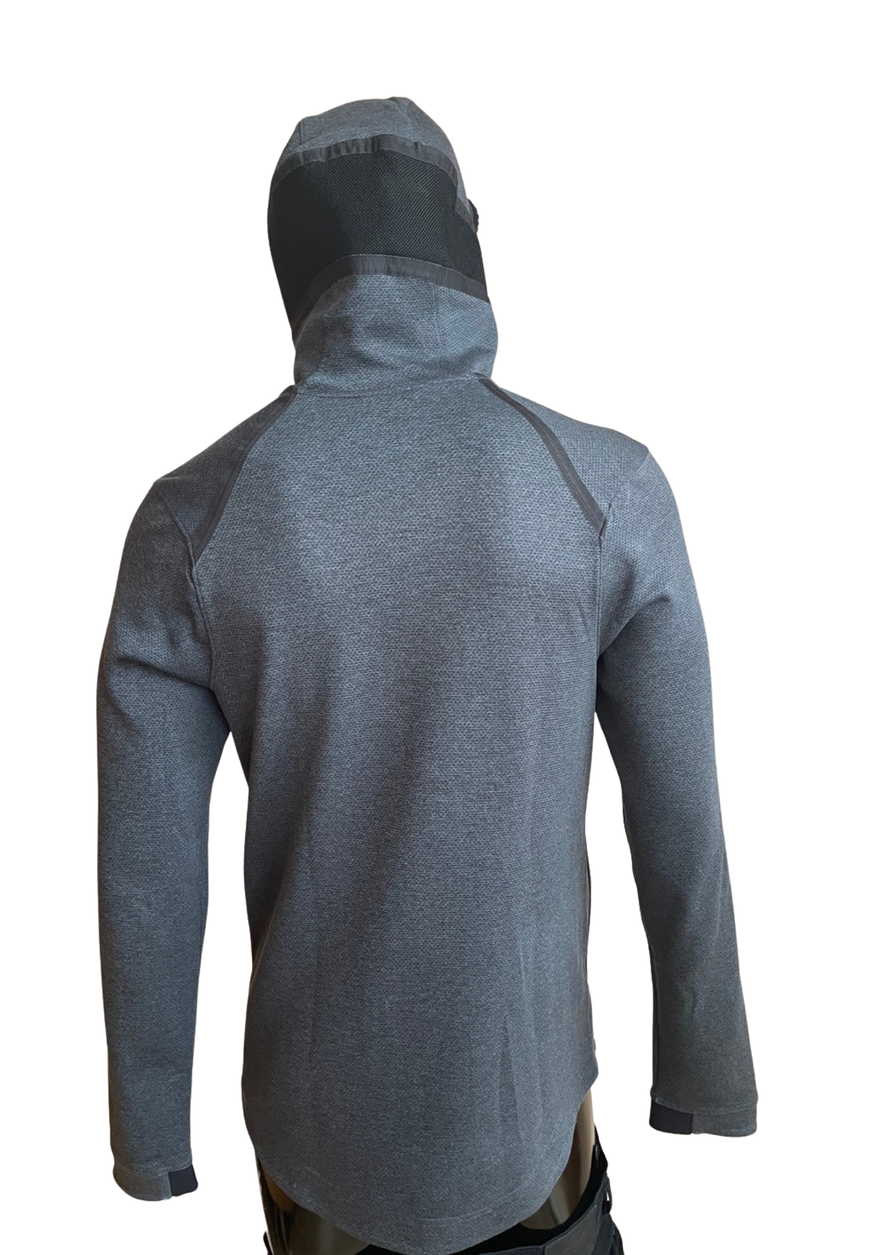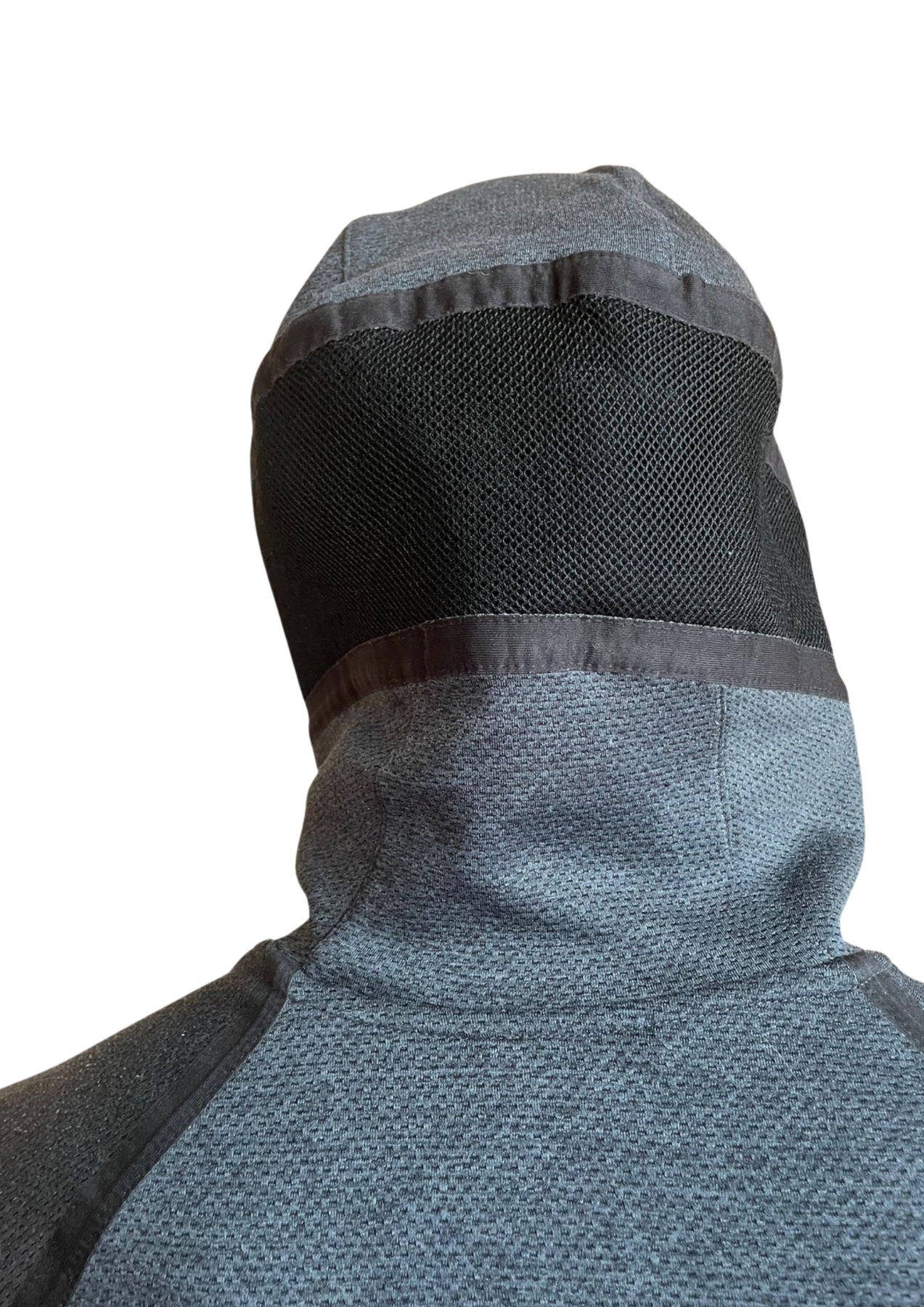 La capuche intégrée avec empiècement mesh respirant améliore la ventilation et apporte un détail technique discret.