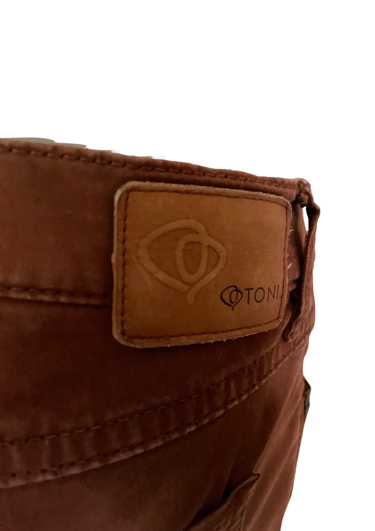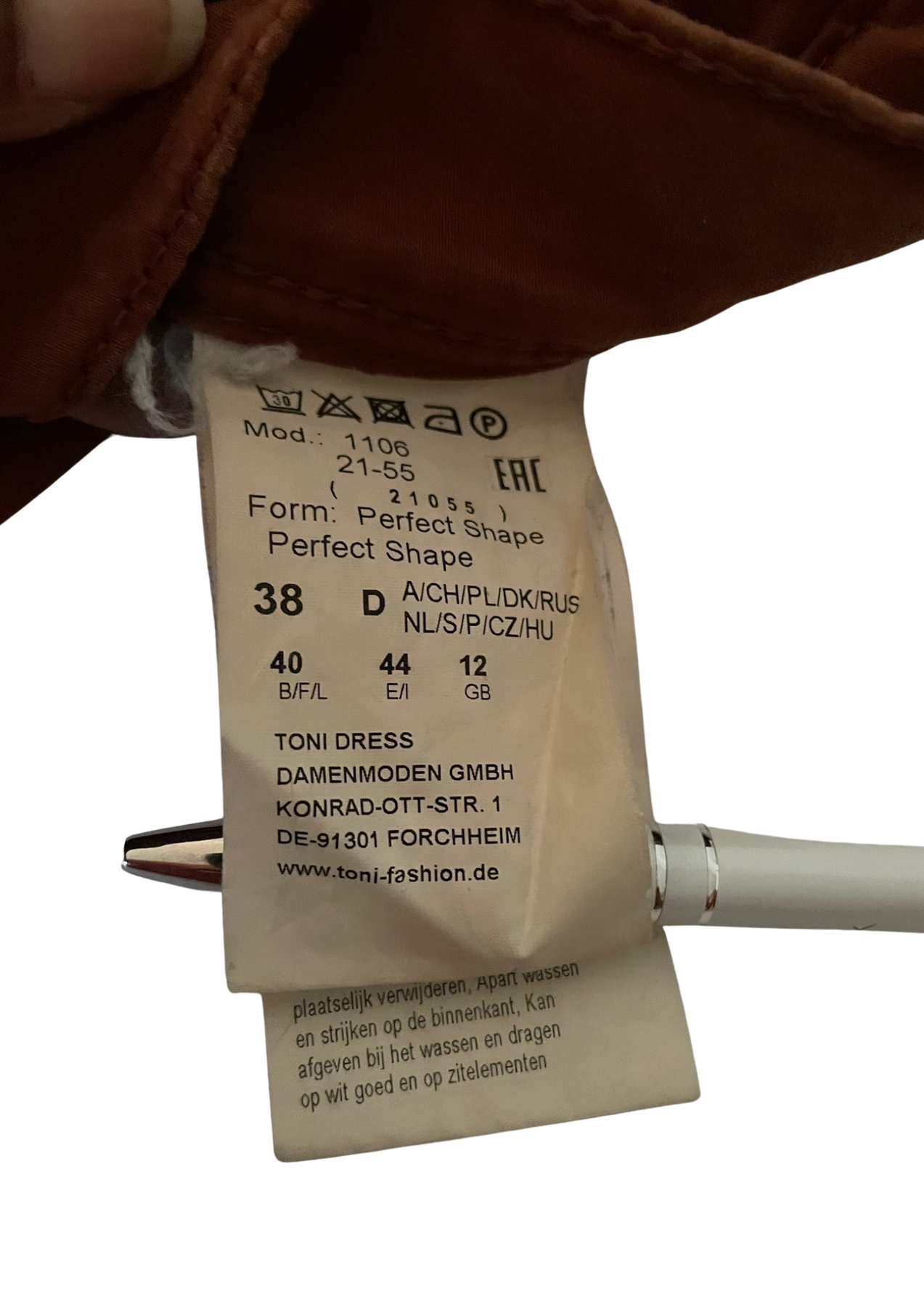 ✨ Détails du produit : Forme : Perfect Shape Coloris : Marron brique 🍂 Taille : 40 Longueur: 101 cm Entrejambe: 78 cm Taille à plat: 40 cm Composition : 64% coton 🌿, 34% polyester, 2% élasthanne Longueur : standard Coupe : droite ajustée Fermeture : bouton + zip Marque : Toni Dress État : ⭐ Très bon état