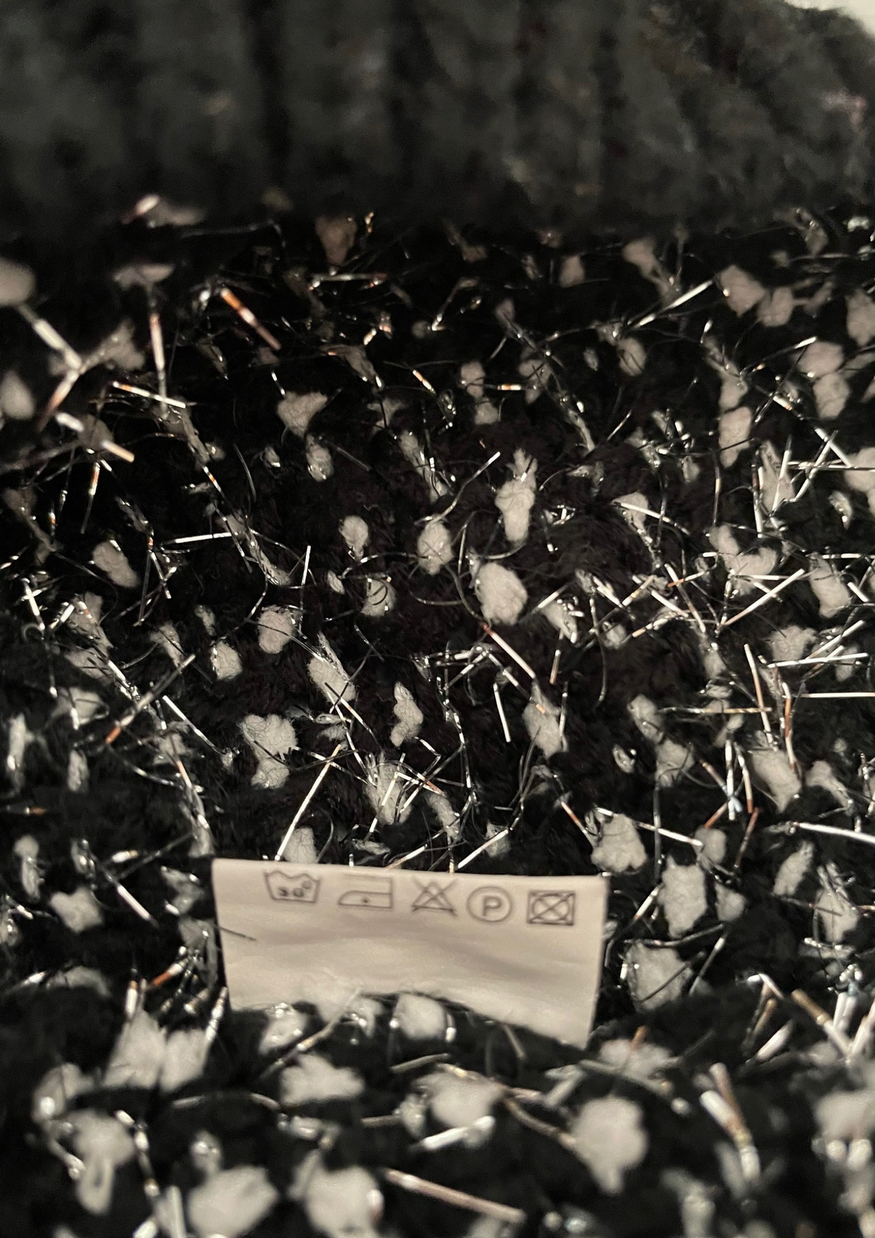 Sa maille texturée noir & blanc relevée de fils argentés capte subtilement la lumière 💫.