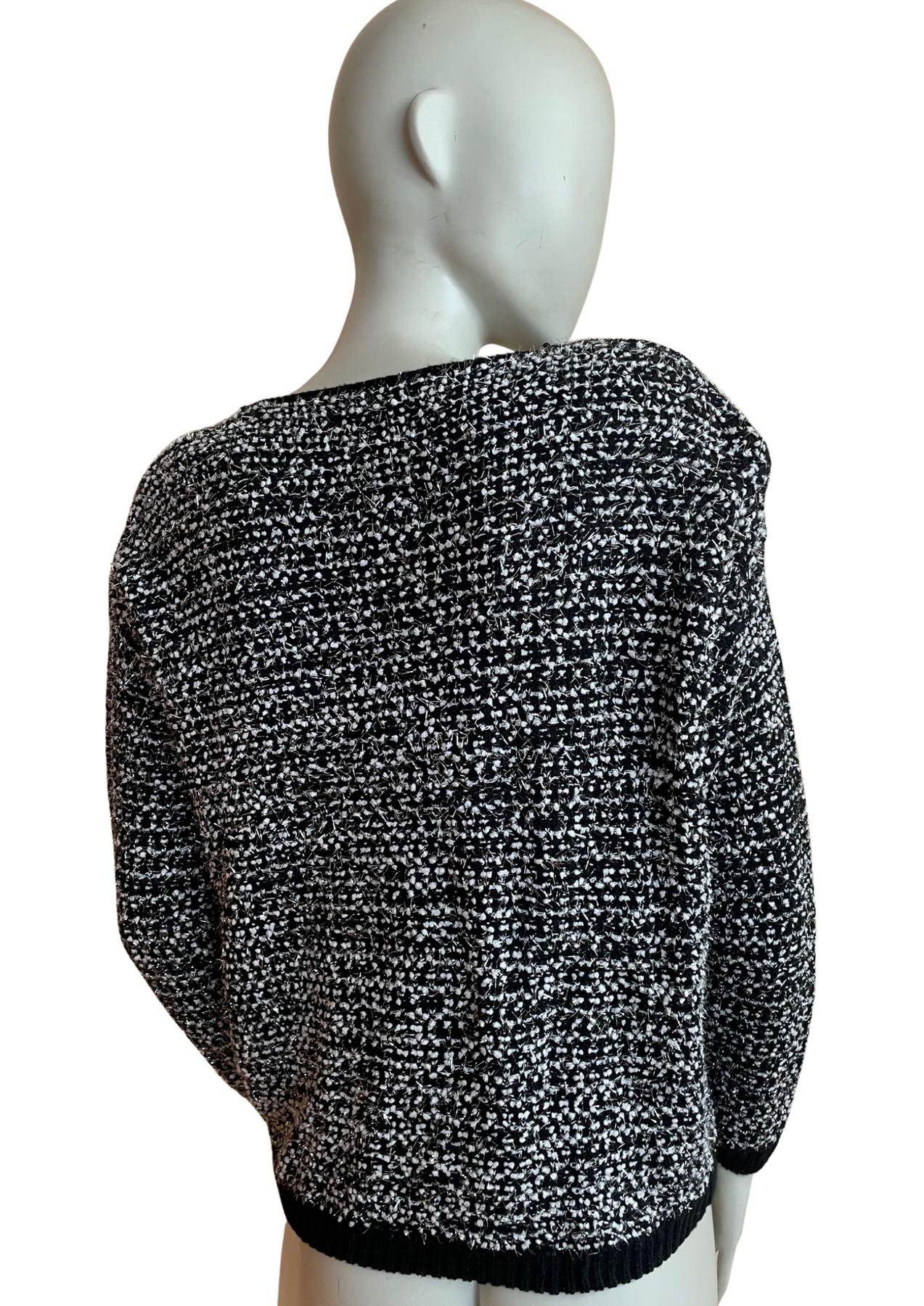 📏 Détails : • Taille : S/M Longueur: 62 cm Aisselle à Aisselle: 55 cm Carrure: 45 cm • Couleur : noir & blanc avec fil argenté ✨ • Composition : 65% laine 🐑 – 35% acrylique • Encolure : V avec zip doré • État : très bon état général 🌸
