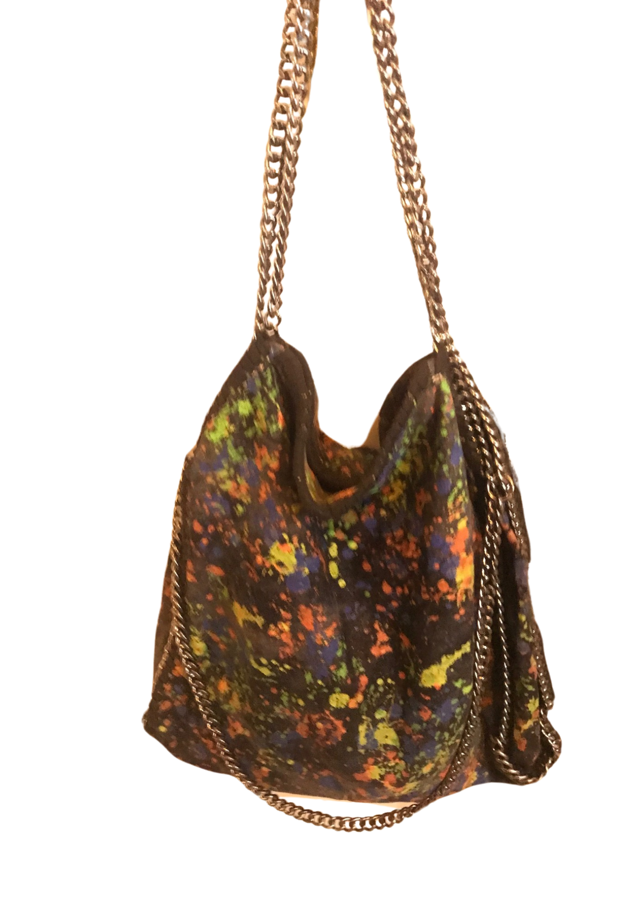 Le sac présente un tissu noir avec des éclaboussures de peinture multicolores.