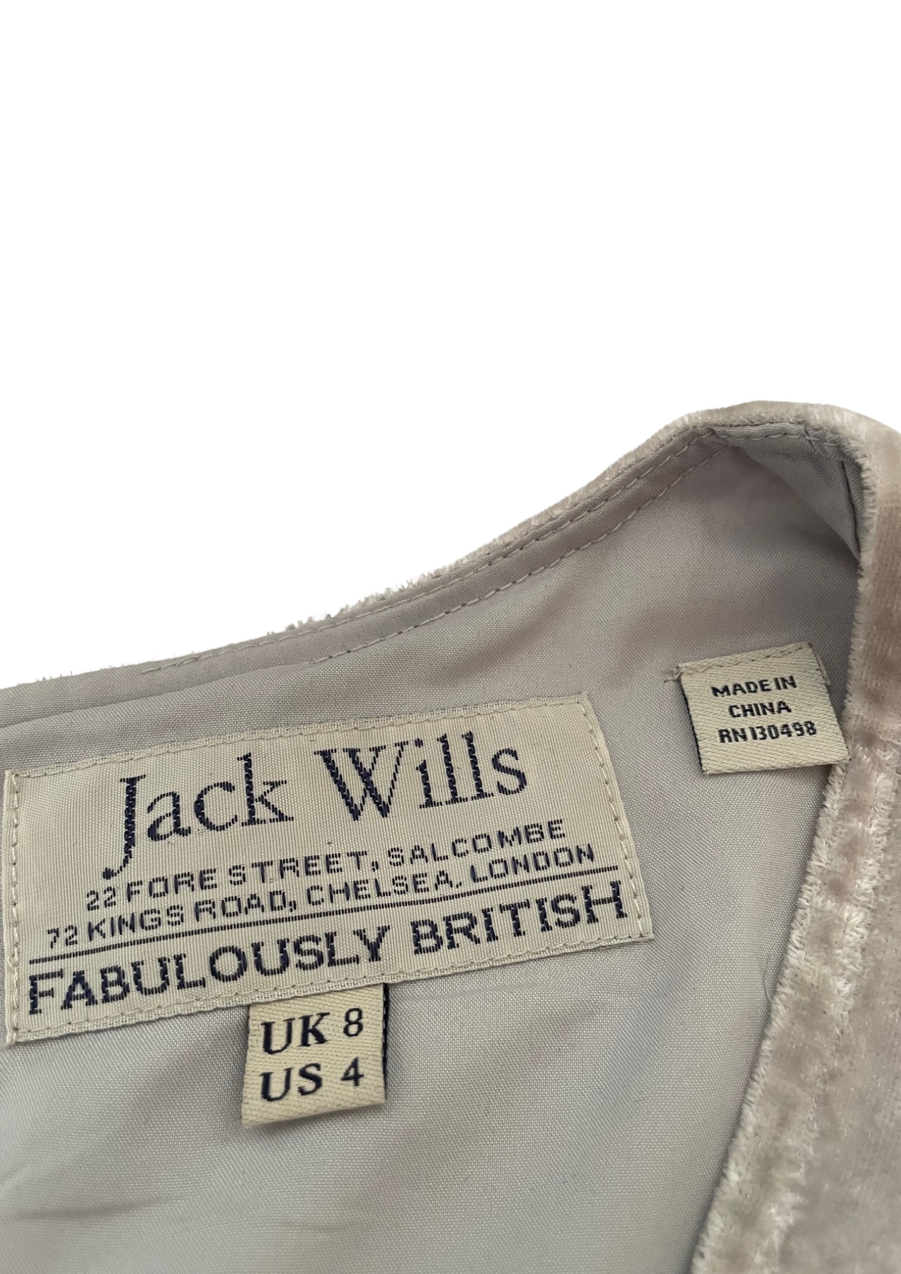 🔸 Marque : Jack Wills – Fabulously British 🇬🇧 🔸 Couleur : Gris argenté, effet lumineux 🔸 Matière : Velours doux et légèrement extensible 🔸 Taille : UK 8 / US 4 (équivaut à un 36 FR) Longueur: 56 cm Aisselle à Aisselle: 45 cm Carrure: 35 cm 🔸 Coupe : Cintrée, bas évasé peplum, manches courtes 🔸 Détails : Décolleté en V croisé, dos goutte d’eau avec bouton 🔸 État : Excellent état ✅