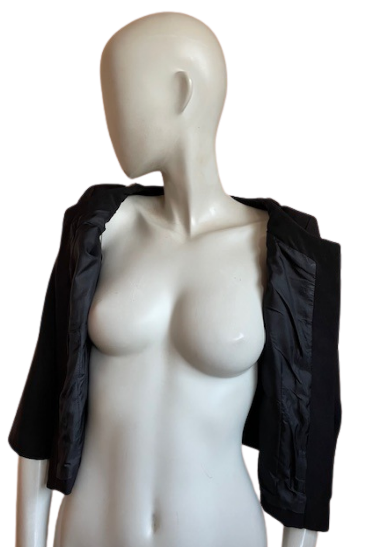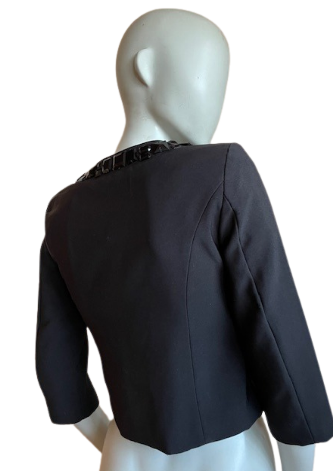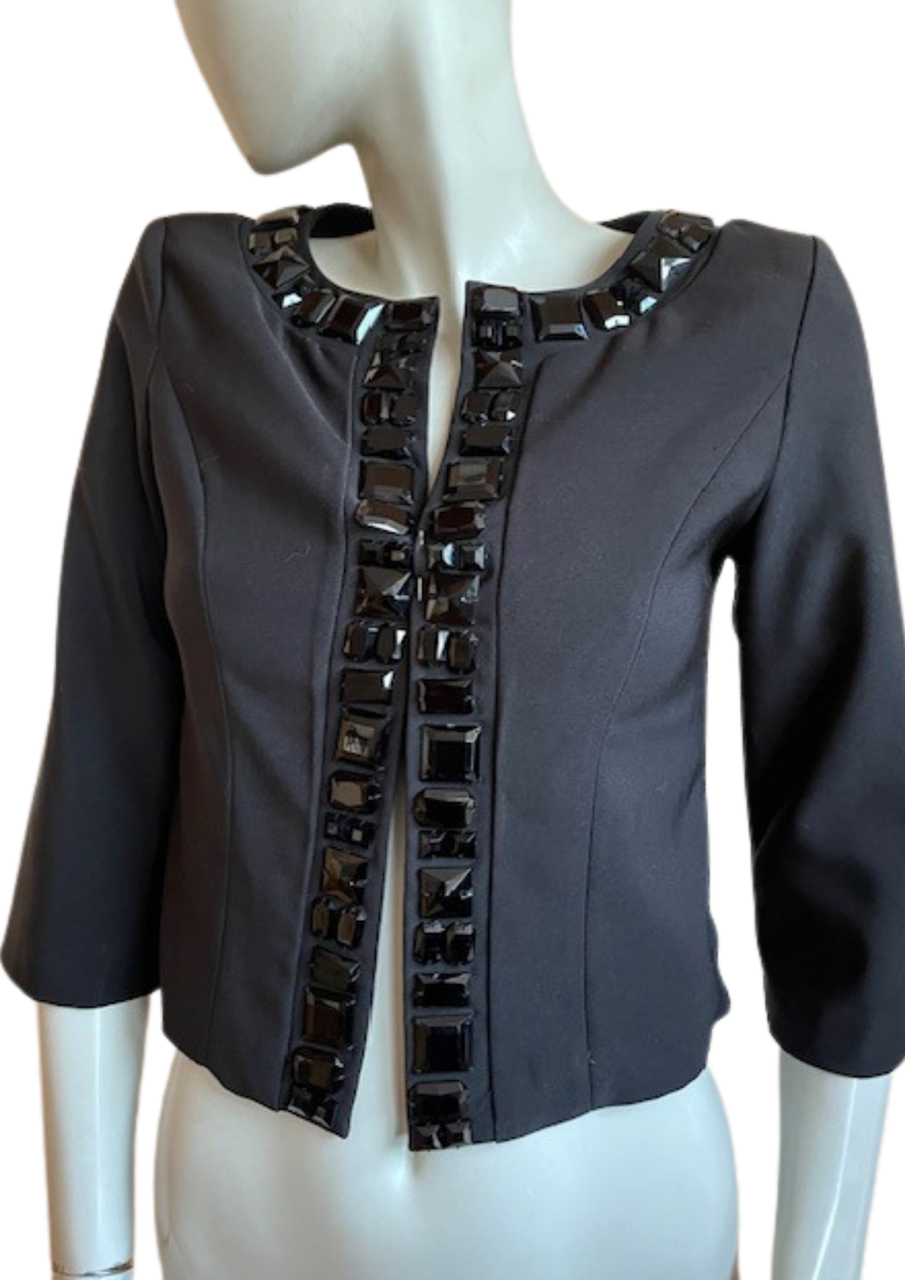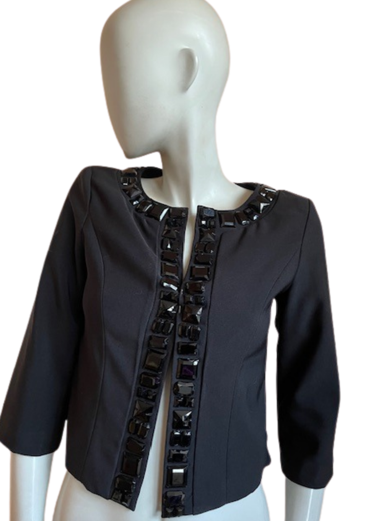 Détails : • Taille : 34 (UK 6 / US 2) Longueur: 48 cm Aisselle à Aisselle: 42 cm Carrure: 35 cm Longueur des manches: 43 cm • Matière : 96% polyester – 4% élasthanne • Doublure : 100% polyester • Fermeture ouverte (sans boutons) • Strass noirs décoratifs ultra brillants ✨ • Très bon état 💯