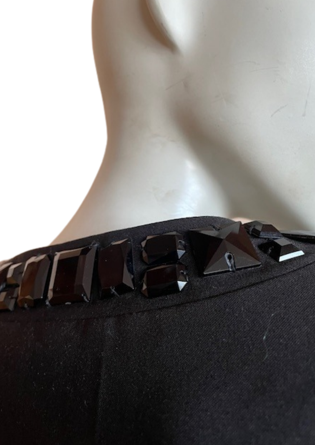 Son design raffiné met en valeur un col rond et une ouverture décorée de larges strass noirs facettés 💎, apportant lumière et sophistication à toutes tes tenues.